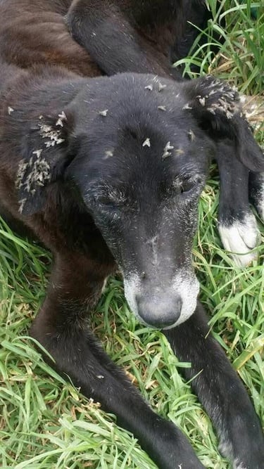 Es una costumbre cruel de la gente: esperar a que un perro esté viejito para botarlo. Eso le pasó a él. Lo encontramos en un basurero, no como un animal, sino como una cosa. Estaba tan débil que no podía moverse, y las moscas... las moscas se lo estaban comiendo vivo. Cada mosca era un recordatorio de que, para el mundo, su vida ya había terminado.
